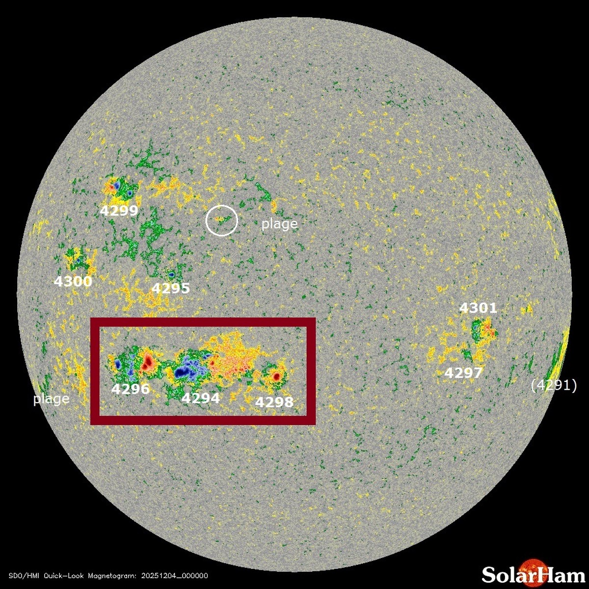Tento „magnetický chaos“ činí aktivní sluneční skvrny AR4296, AR4294 a AR4298 potenciálně nebezpečnými. Pokud se protichůdné polaritní prvky dostanou příliš blízko k sobě, může to uvolnit obrovské množství energie, vyjádřené formou silných slunečních erupcí.