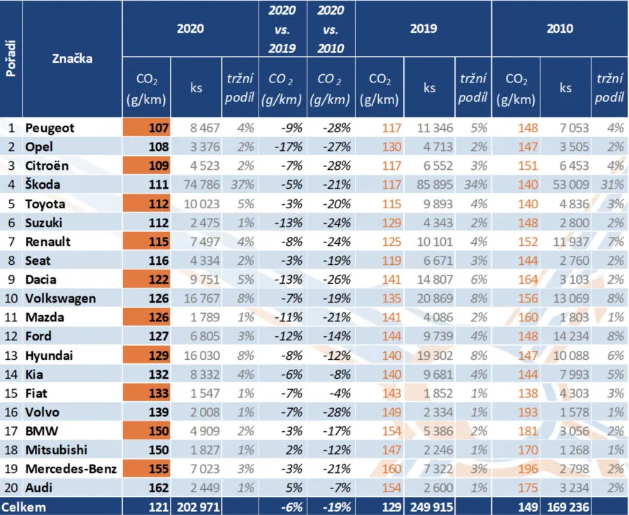 V Česku se v loňském roce podařilo snížit průměrné emise oxidu uhličitého z nově registrovaných osobních vozů o 6 %. Hlavní zásluhu na tom mají elektromobily a plug-in hybridy. Ale vývoj jde dopředu i u spalovacích motorů, které se díky moderním technologiím staly šetrnějšími než kdy dřív. Z pohledu čistoty provozu si nejlépe vedl Peugeot, kdežto Audi naopak ztratilo.
