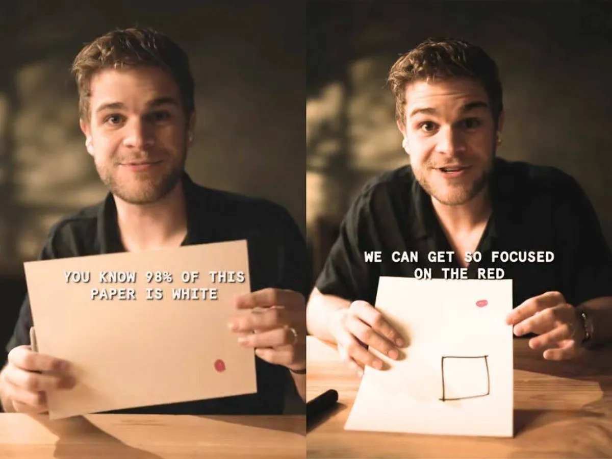Psychoterapeut Matthias J. Barker, který je velmi populární na sociálních sítích, použil výstižnou metaforu v jednom ze svých známých videí: „Když jsme ve stresu nebo cítíme bolest, naše pozornost se zaměří na kontrast, je to tak?“ Ve videu ukazuje bílý papír s červeným kolečkem a pokládá jednoduchou otázku: „Jaká barva vás při pohledu napadne jako první?“ Většina lidí odpoví „červená“, i když papír je z 98 % bílý. „Proč 2 %? Protože vynikají – jsou v rozporu s tím zbytkem,“ vysvětluje Barker.