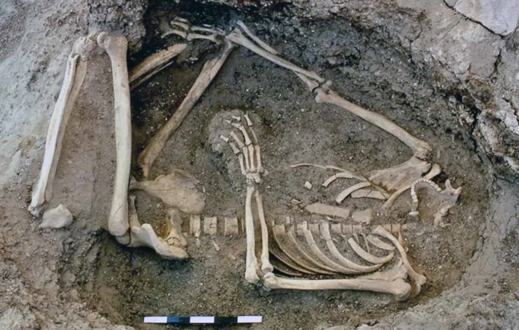 Během výzkumu byl objeven i kosterní pozůstatek dospělého muže robustní postavy (zhruba 170 cm vysoký). Pohřbený byl ve skrčené poloze s hlavou vytočenou do strany — v odpadní jámě. Na rozdíl od tehdejšího standardu (kremace a ukládání popela do uren mimo sídliště) šlo o takzvaný „atypický“ pohřeb bez známek násilí nebo podvýživy. Nabízí se řada otázek: šlo o rituál, druhotný pohřeb, nebo projev jiné společenské vrstvy? Odpovědi zatím chybí.