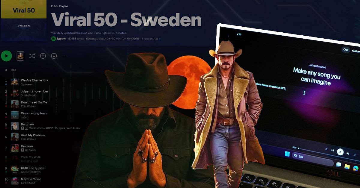 Když SVT analyzovala skladby na tomto žebříčku, ukázalo se, že 18 z 50 – tedy 36 procent – jsou skladby vytvořené AI. Dokonce i Billboardova lista „Country Digital Song Sales“ byla po dobu tří týdnů vedena skladbou od AI.