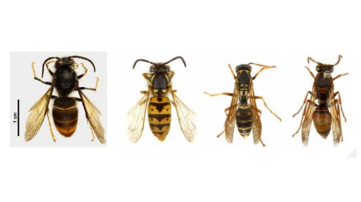 Žlutohnohá vosa (na obrázku vlevo) porovnávána s druhy zavedenými na Novém Zélandu: (zleva doprava) německá vosa (Vespula germanica), asijská papírová vosa (Polistes chinensis) a australská papírová vosa (Polistes humilis). Foto / Biosecurity New Zealand